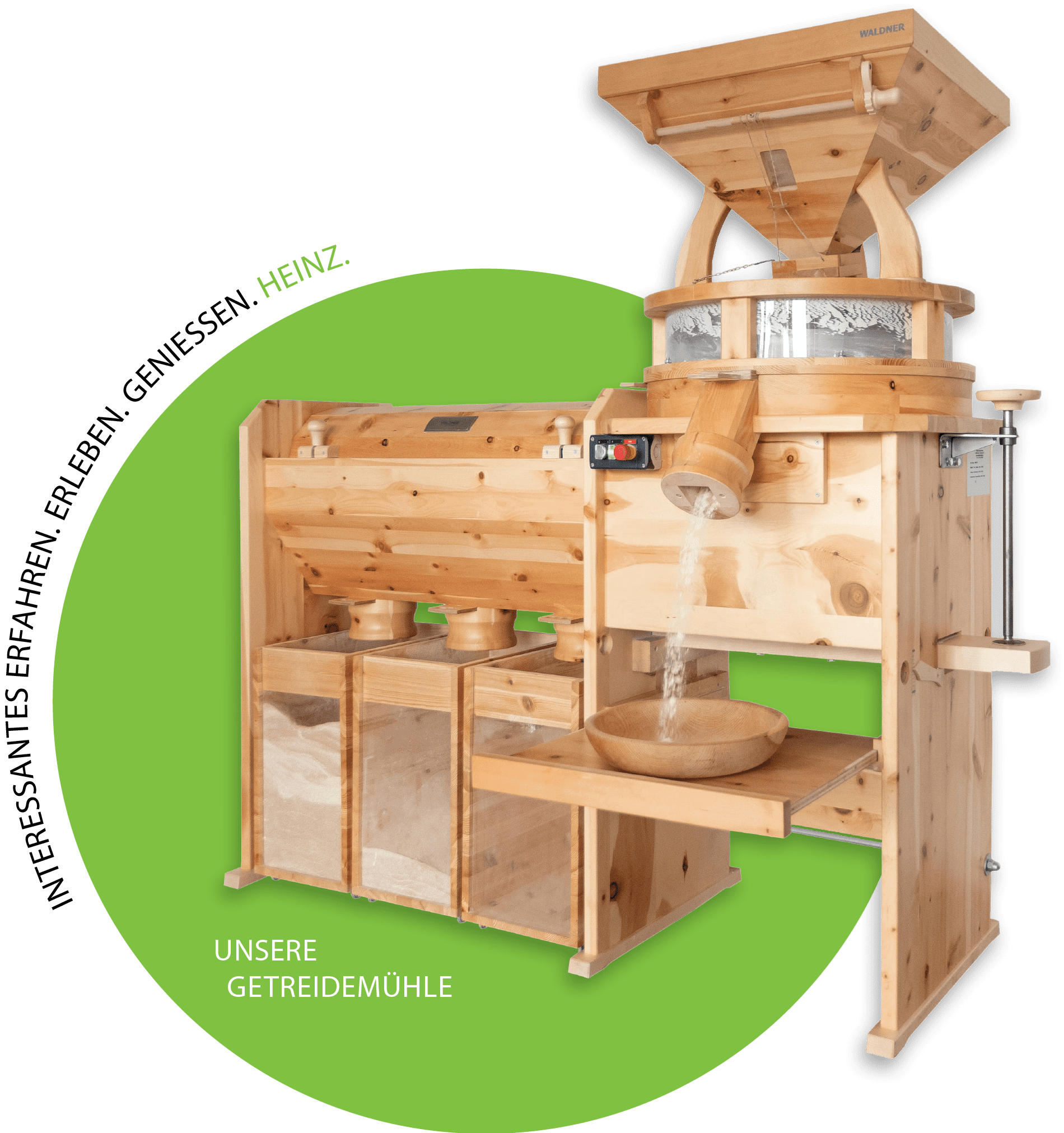 Diese echte Osttiroler Getreidemühle stammt aus dem Hause der Firma Waldner Biotech GmbH. Mit viel Liebe zum Detail wurde sie händisch aus Zirbenholz gefertigt. In der Mühle arbeitet ein Kunstmühlstein, gegossen aus Naxos-Basalt mit einem Durchmesser von 50 cm. Im angebauten Siebkasten kann das Mehl gesiebt werden. So produzieren wir unsere „Fein“-Mehle und den Grieß. Die anfallende Kleie wird an die Rinder als wertvolles Energiefuttermittel verfüttert.